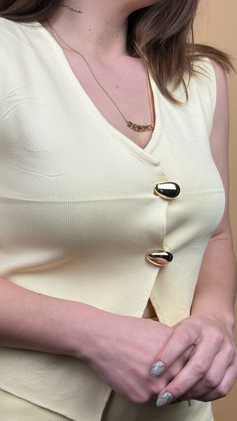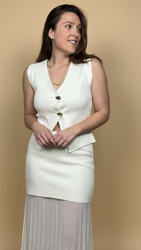 El chaleco entallado con botones joya estiliza la silueta y eleva el conjunto, mientras que la falda midi con acabado plisado crea un efecto sofisticado y femenino.