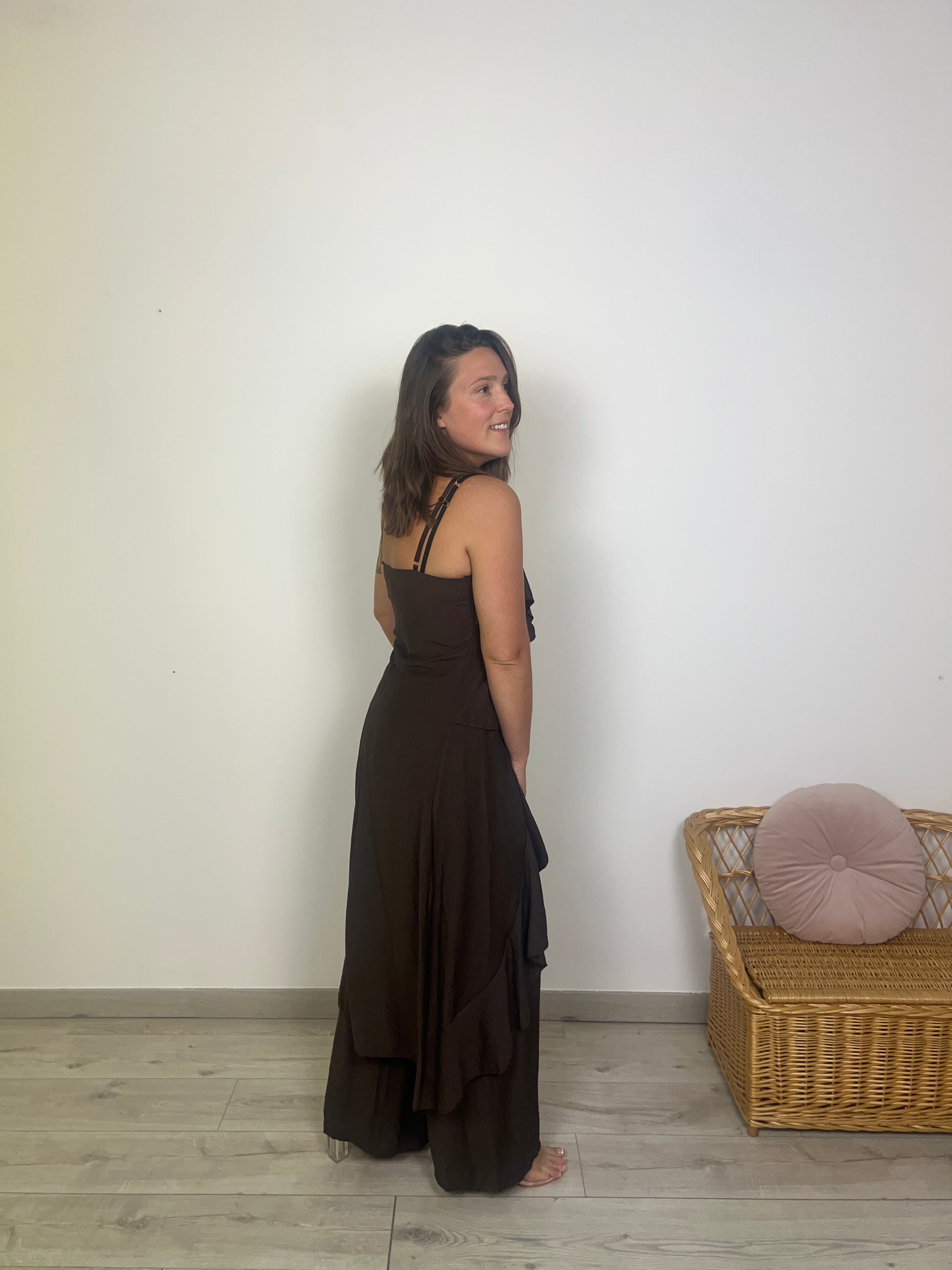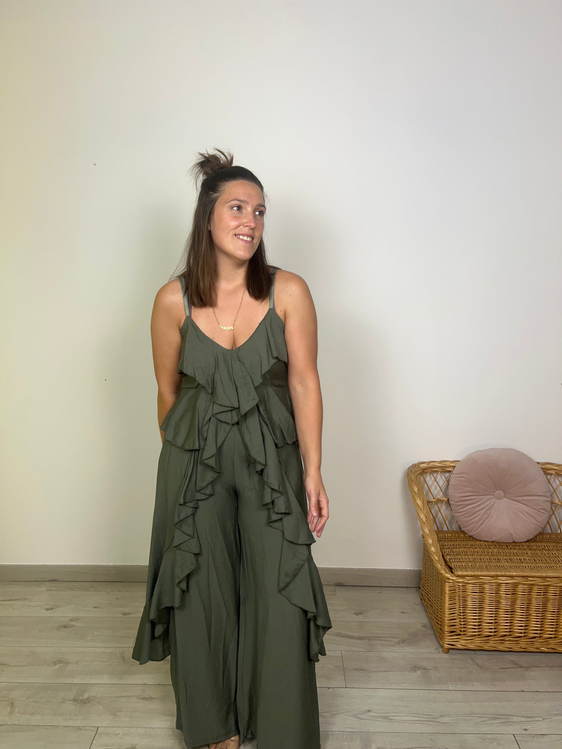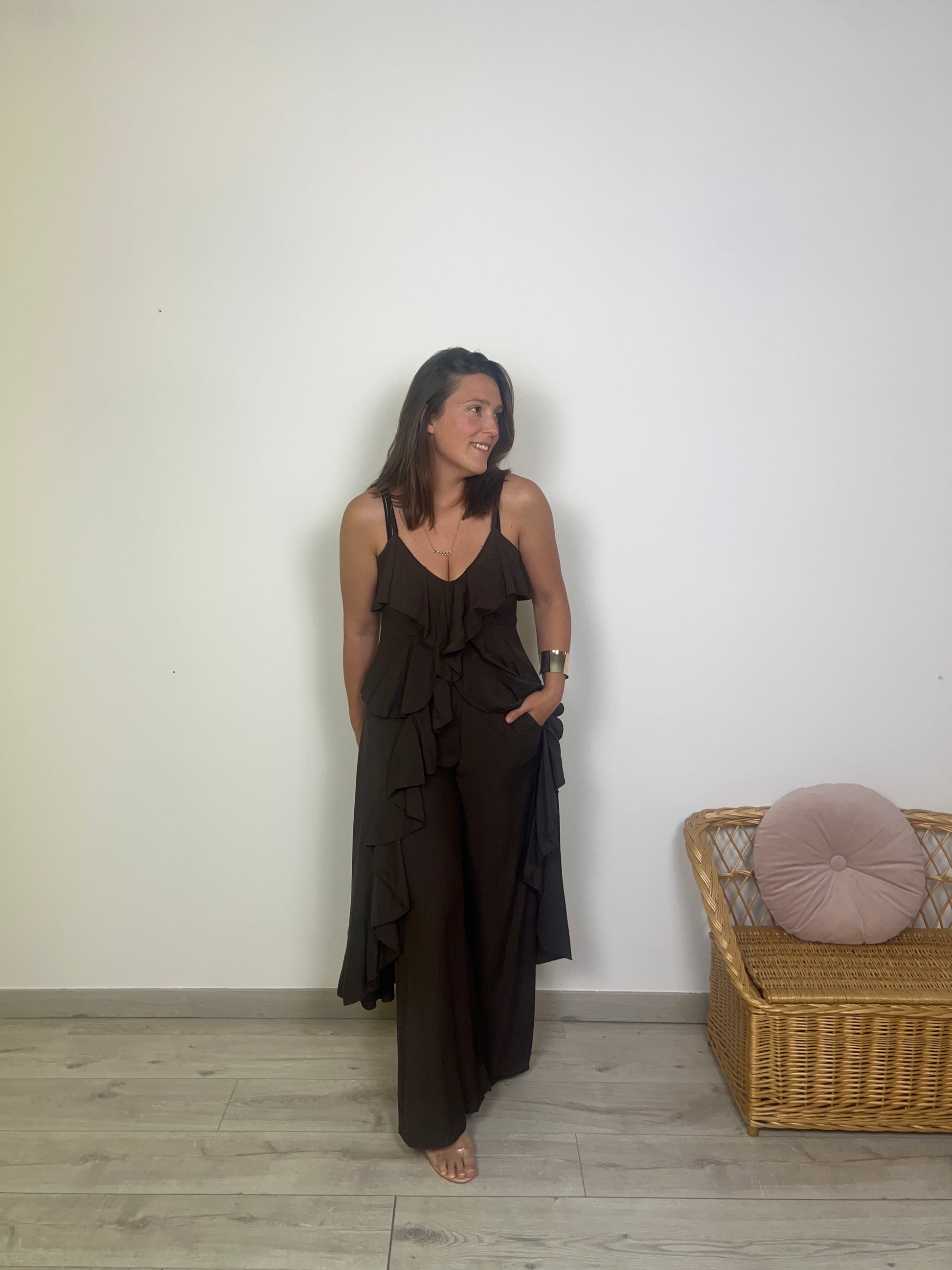 El top, de tirantes finos y escote en V, está pensado para estilizar el cuello y los hombros, mientras que el corte con volados cruzados aporta un toque de feminidad y distinción. La parte inferior, tipo pantalón palazzo con sobrefalda, alarga visualmente las piernas y genera un efecto visual encantador al caminar.