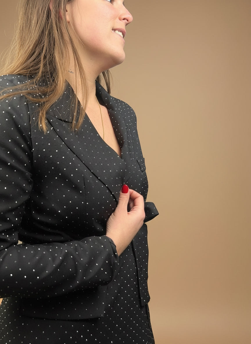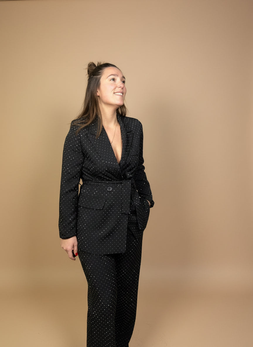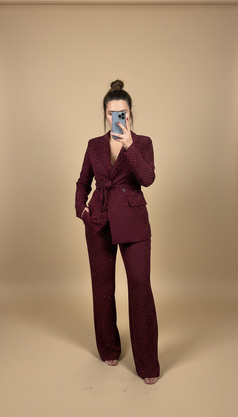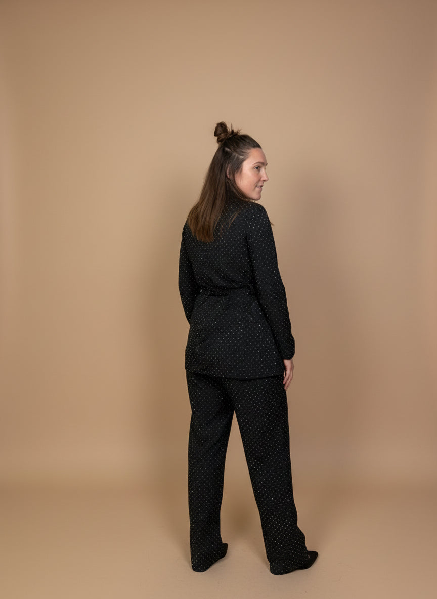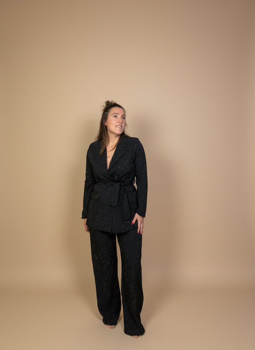 La americana incorpora una lazada que permite ajustar la cintura y estilizar la figura, mientras que el pantalón de corte recto aporta comodidad y una caída favorecedora. Un conjunto versátil, ideal tanto para ocasiones especiales como para un look arreglado de diario.